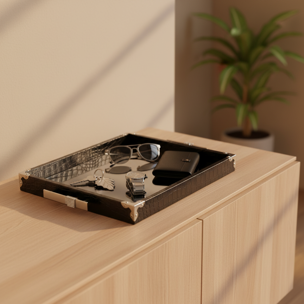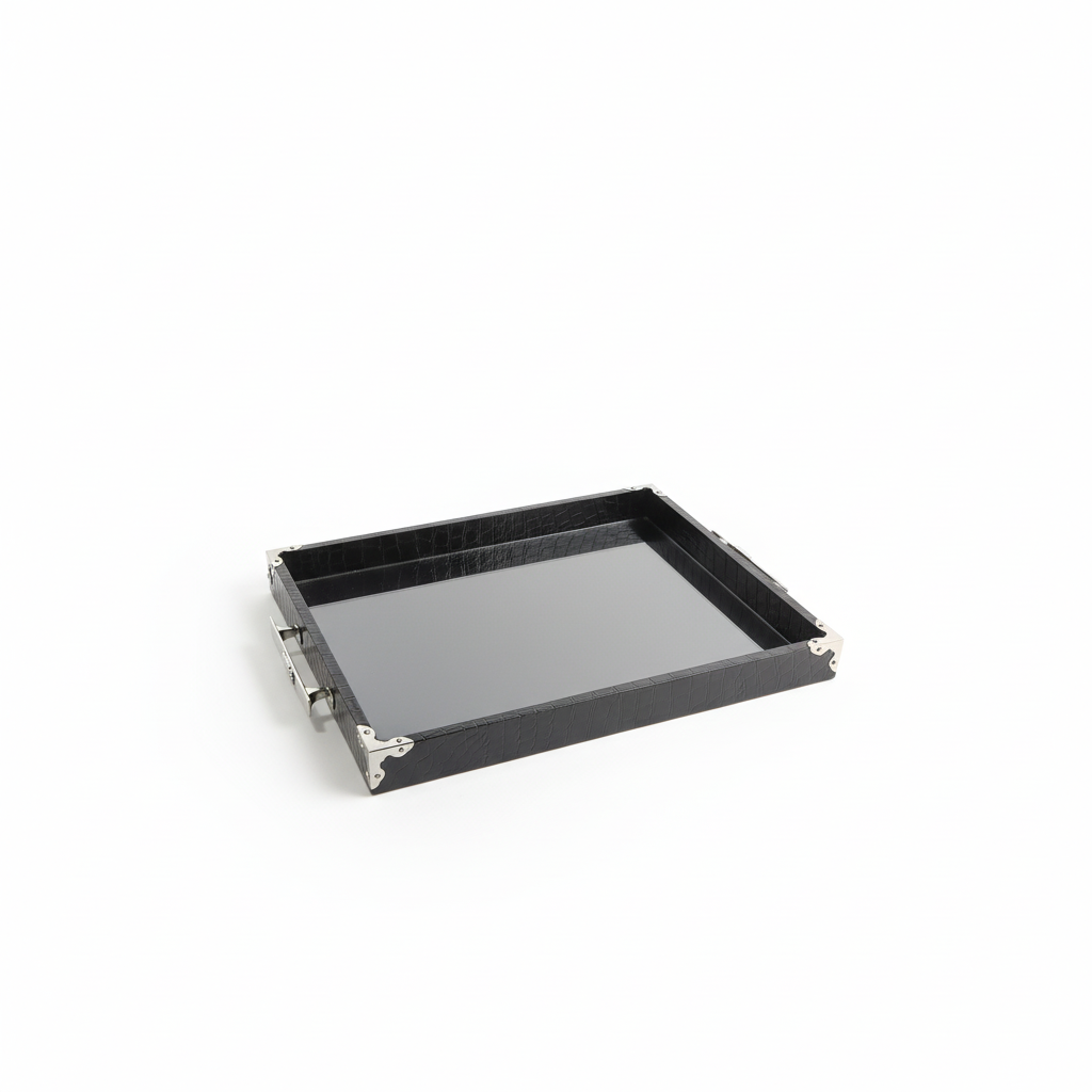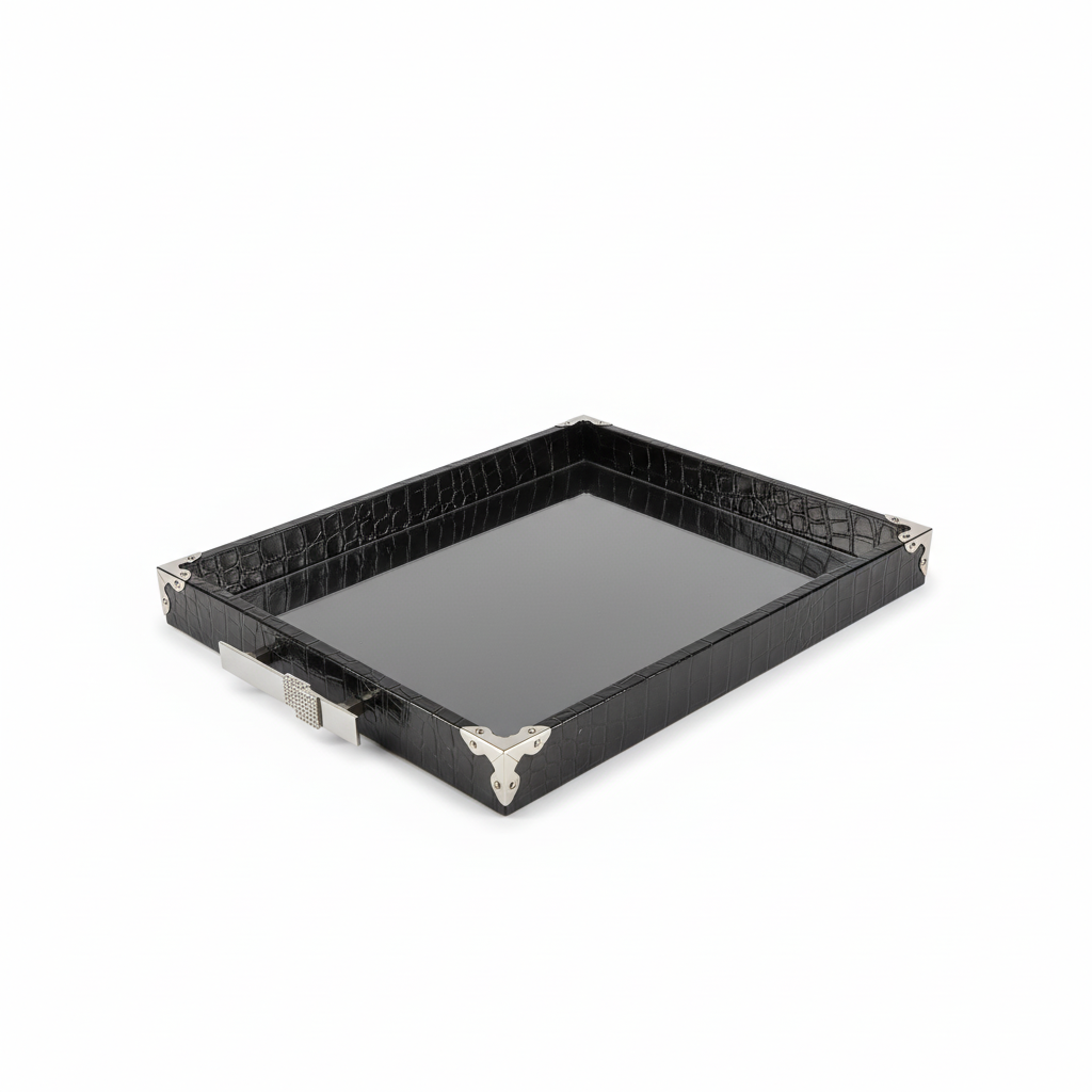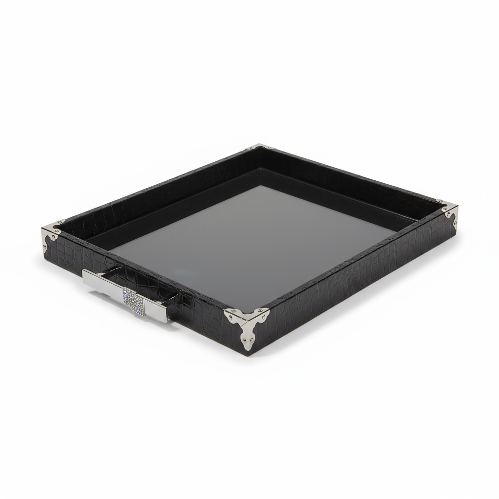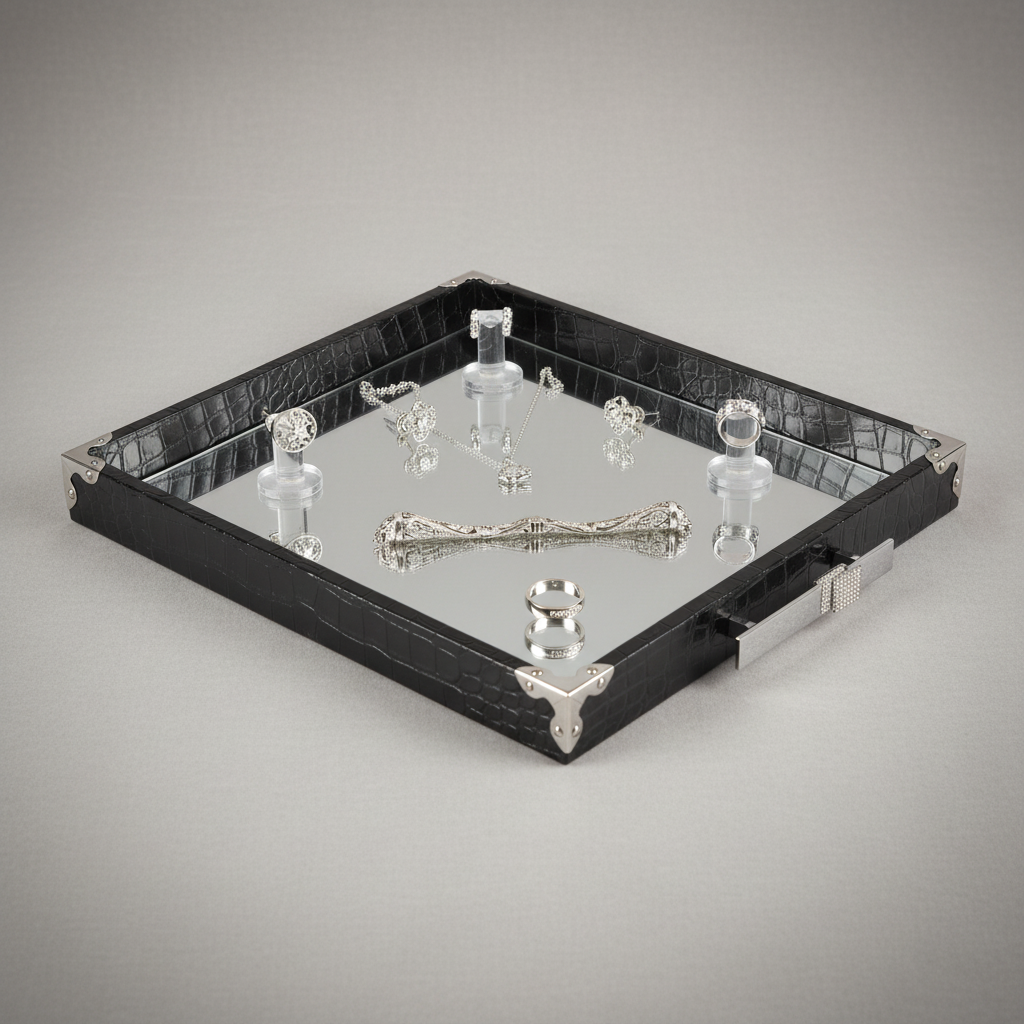 Edles Präsentations-Tablett aus strukturiertem Leder mit massiven Stahlgriffen. Der Boden ist ein Spiegel, der saubere Reflexionen erzeugt und Produkte hochwertig inszeniert. Ein umlaufender Rand mit kleinen Steinchen sorgt für dezenten Glanz – ideal für Schmuck, Accessoires und Premium-Artikel im Store, Studio oder Zuhause.
