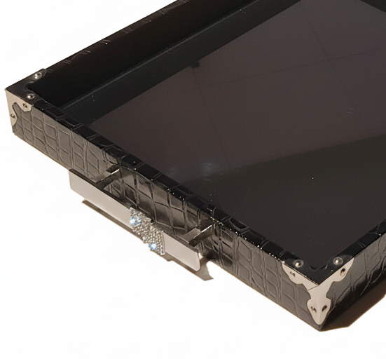 Leder-Displaybrett mit Stahlgriffen & Spiegelboden – mit Zier-Steinchen