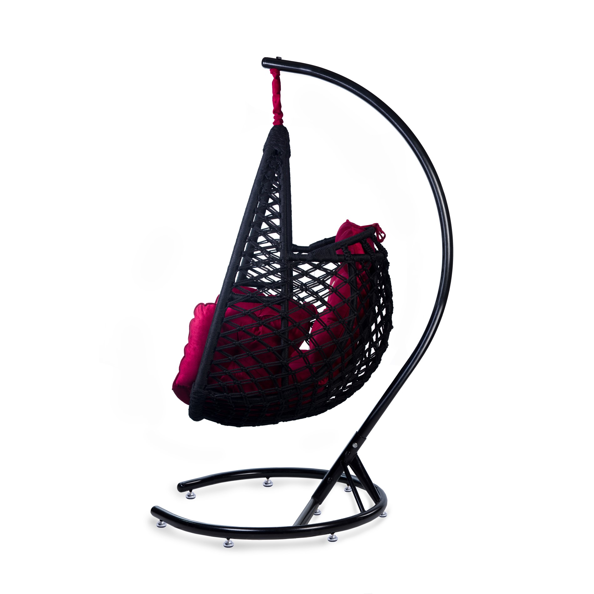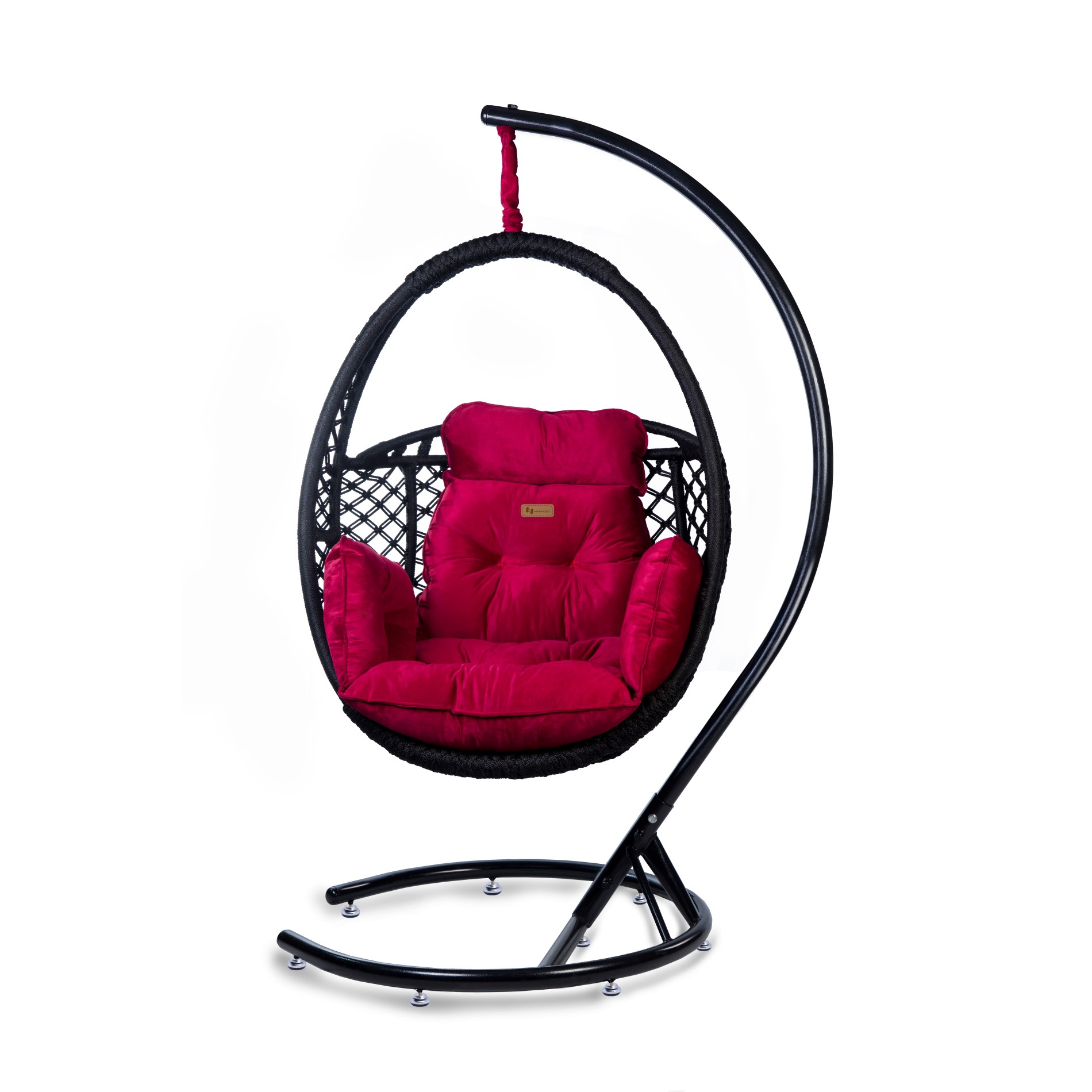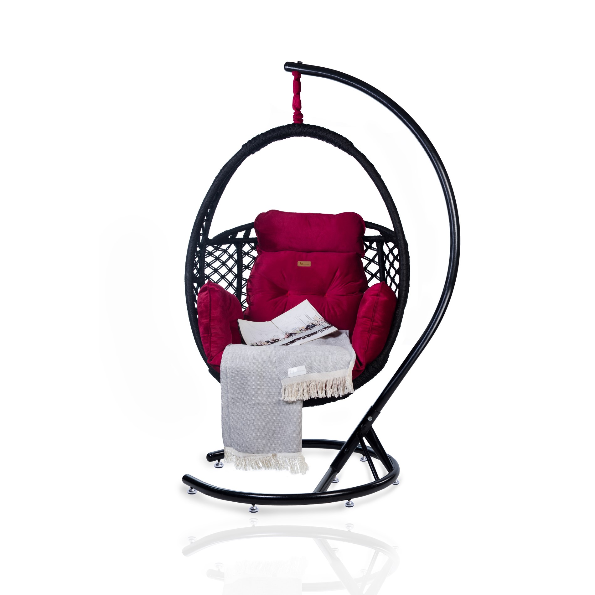 • Zubehör: Verzinkte Hängekette, Heavy-Duty Feder, wasserdichte Abdeckung, handgefertigter Schal, und großes, komfortables Kissen (Farbe: Dunkelrot).