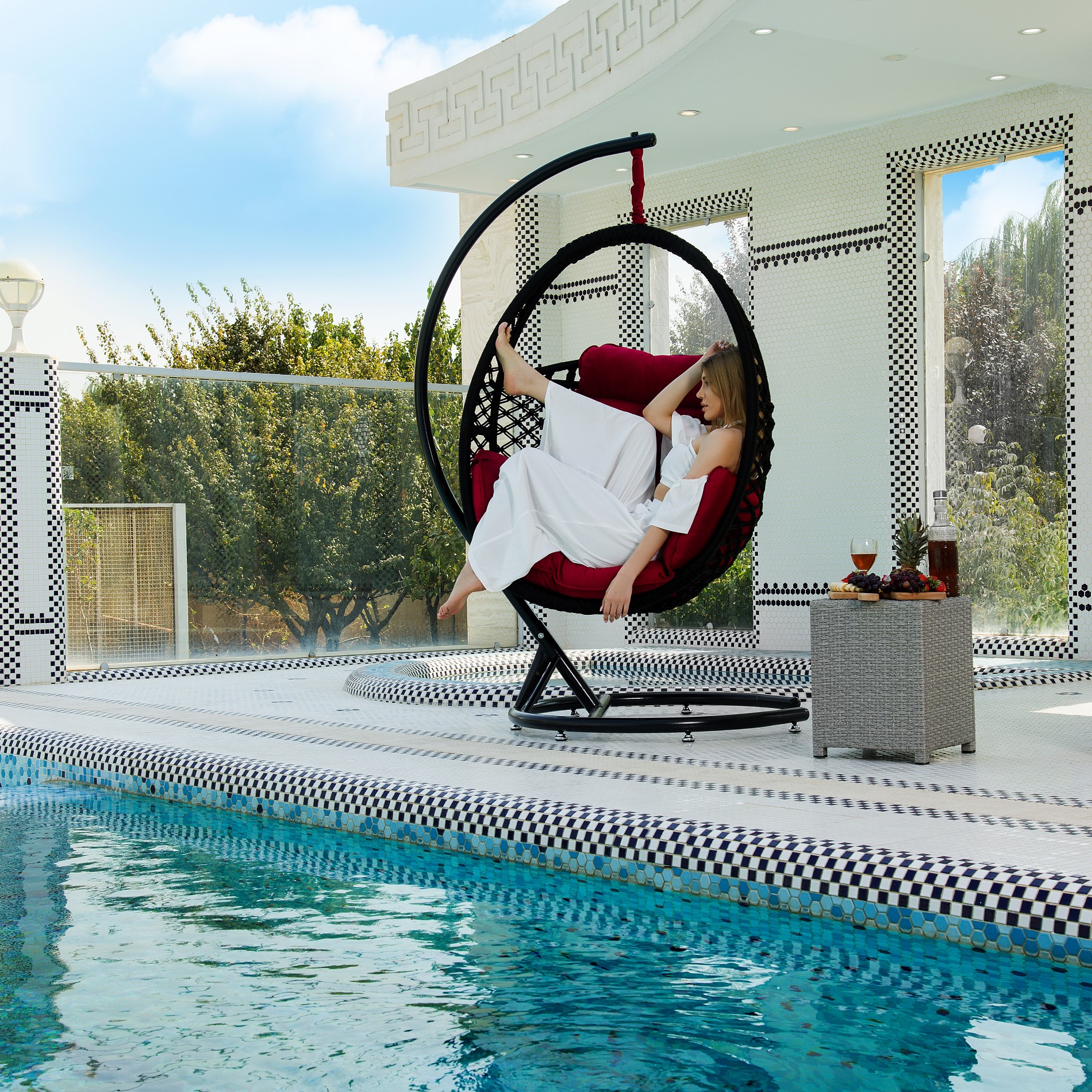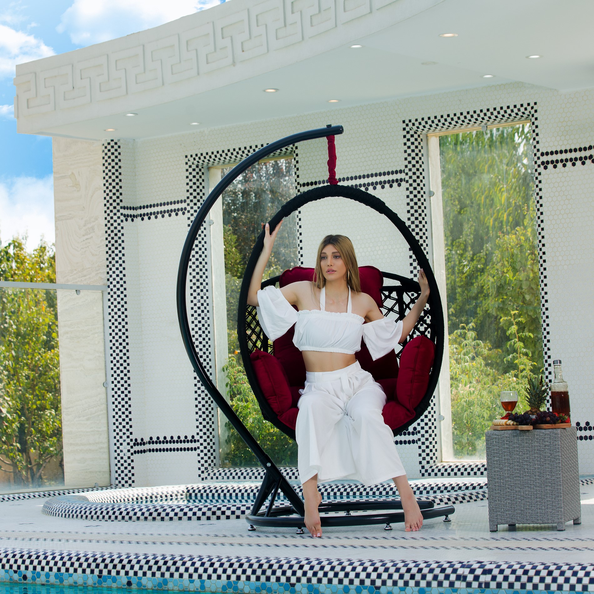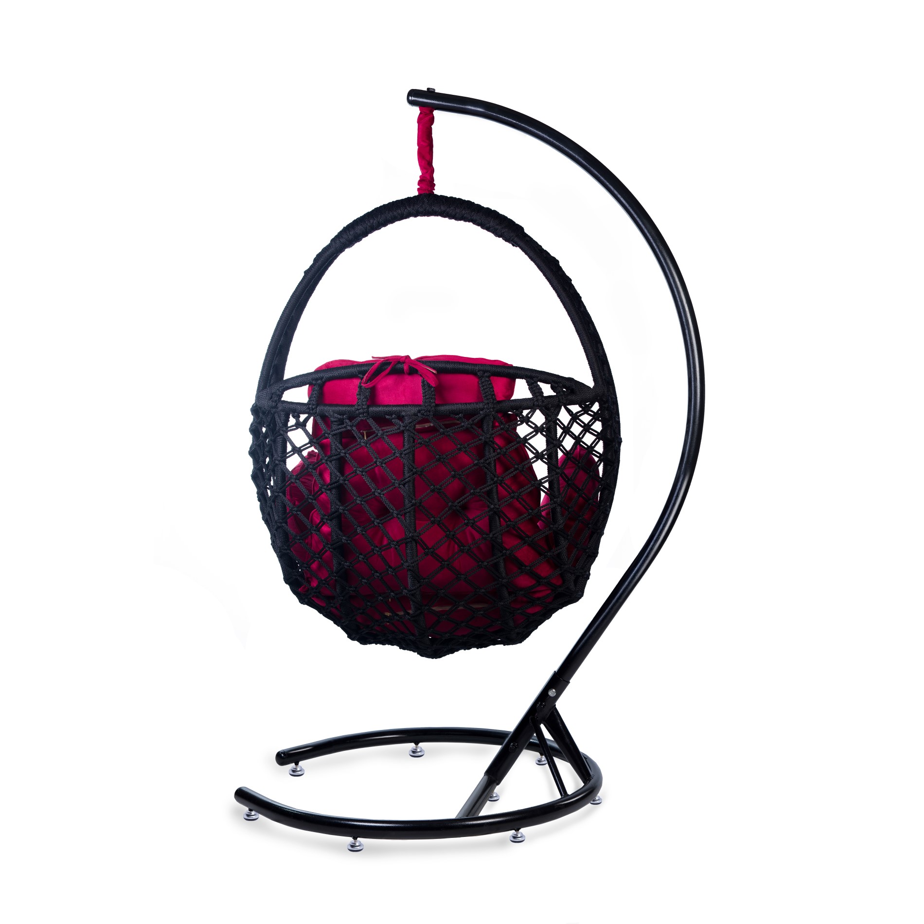 • Zubehör: Verzinkte Hängekette, Heavy-Duty Feder, wasserdichte Abdeckung, handgefertigter Schal, und großes, komfortables Kissen (Farbe: Dunkelrot).