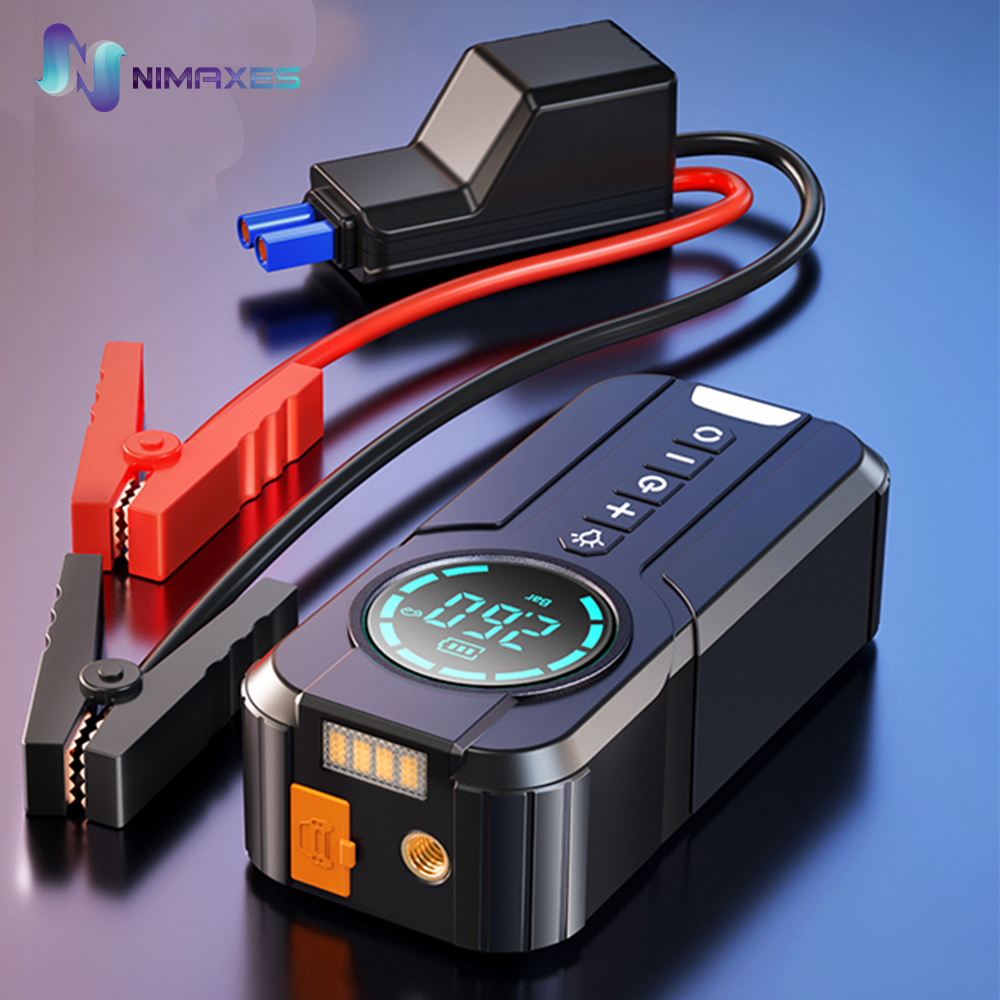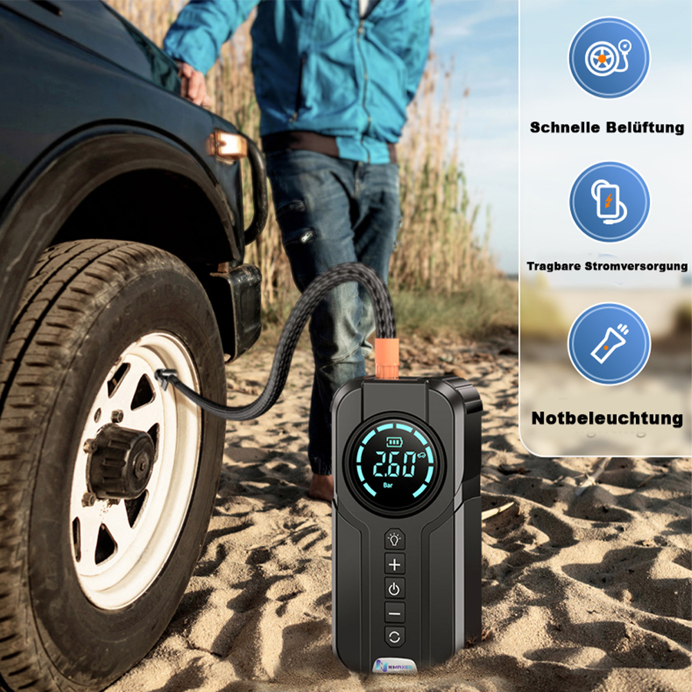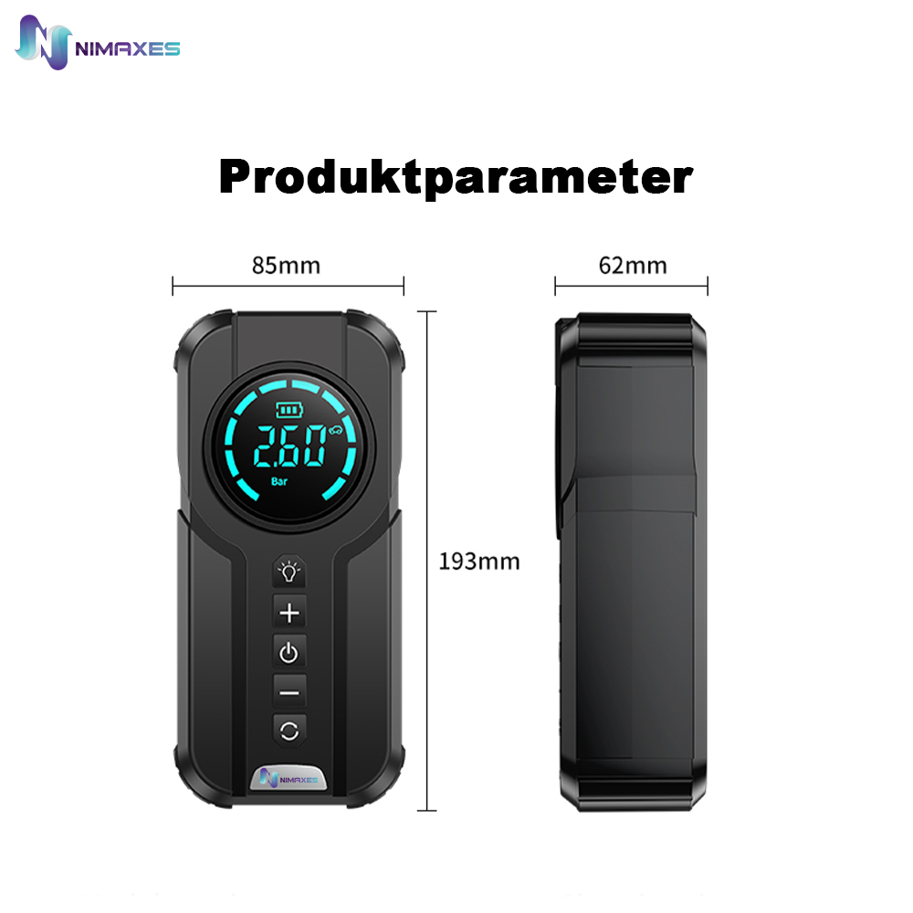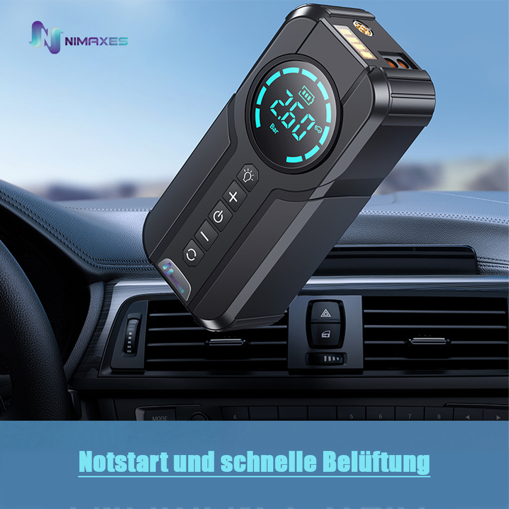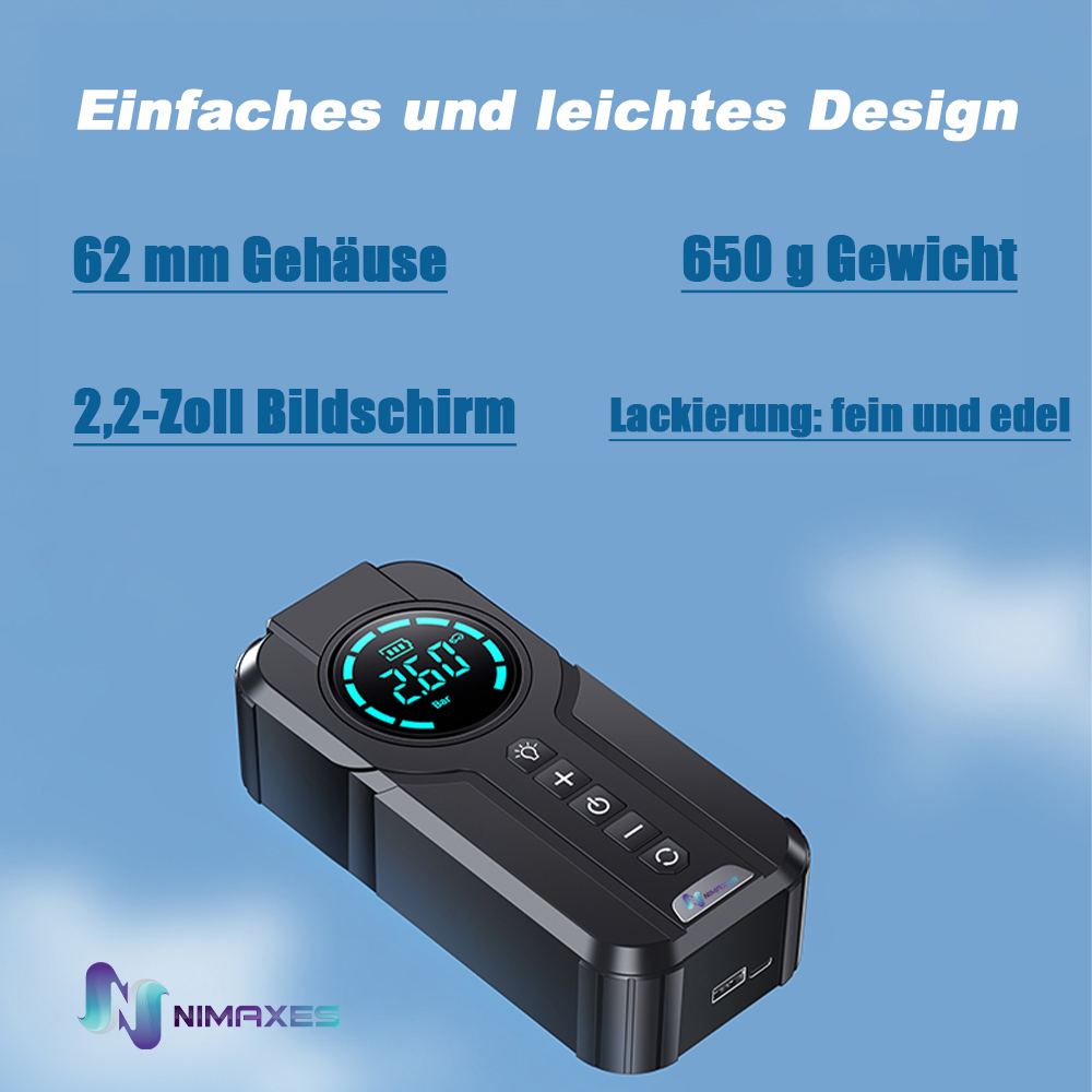 Die Nimaxes 3-in-1 Multifunktionale Wireless-Luftpumpe vereint drei leistungsstarke Funktionen in einem kompakten Gerät: Starthilfe für Fahrzeuge, intelligente Luftpumpe und Powerbank für mobile Geräte. Perfekt für Auto, Zuhause und Outdoor-Einsätze.